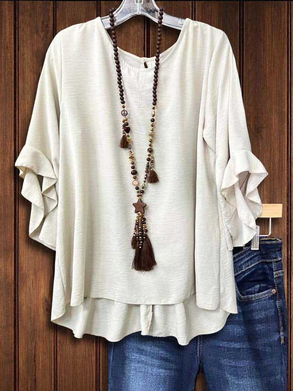 Elevate your everyday look with the Beige Ruffle Sleeve Loose Blouse. This blouse is all about understated elegance, featuring soft, flowing ruffle sleeves that add a touch of grace to your outfit. The loose, relaxed fit ensures all-day comfort, making it perfect for both casual and dressier occasions. Made from lightweight, breathable fabric, this blouse is ideal for the warm Southern climate. Pair it with jeans or tailored pants for a versatile look that transitions effortlessly from day to night. The neutral beige color makes it easy to mix and match with your existing wardrobe, making this blouse a versatile and timeless addition to your collection.