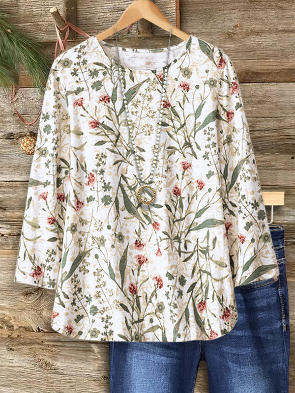 Soft and serene, this crewneck top features an all-over floral and foliage print in earthy tones. Its long sleeves and relaxed silhouette make it a comfortable choice for everyday wear with a touch of natural elegance.