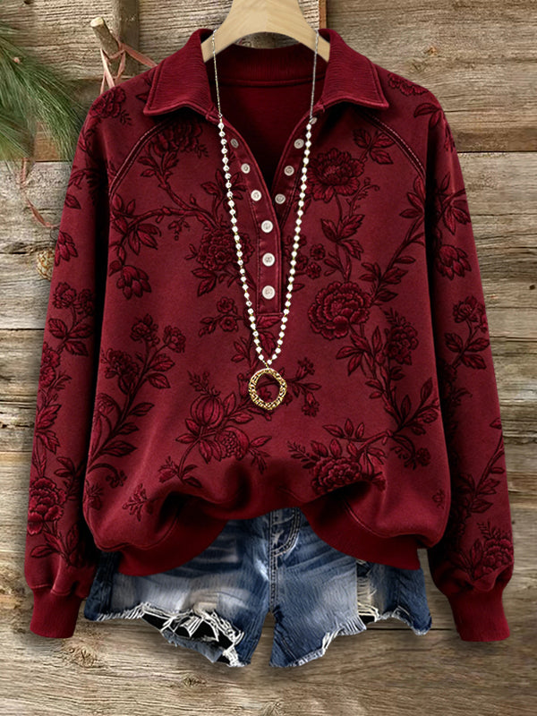 Soft, warm, and detailed with tonal floral embroidery, this Henley sweatshirt is perfect for cozy weekends or chilly evenings.