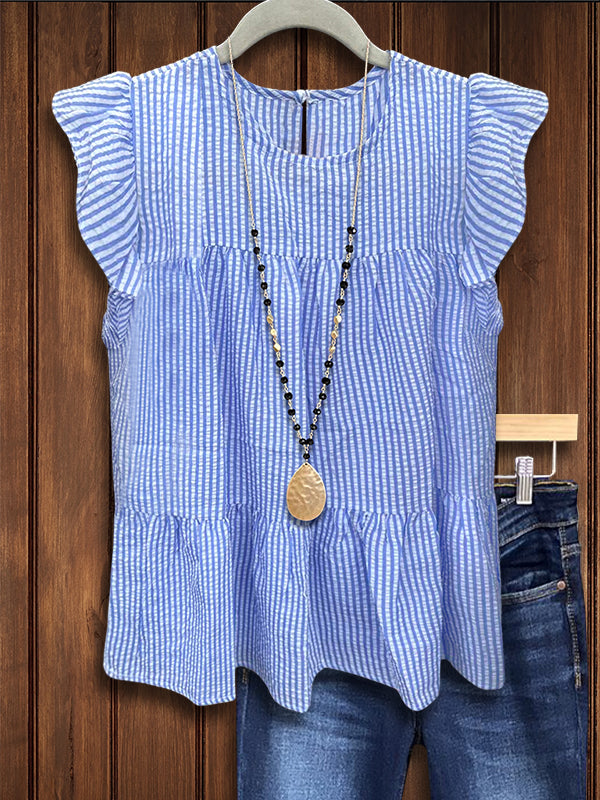 Channel timeless sophistication with our Classic Striped Ruffled Blouse, a versatile staple for every southern wardrobe. Featuring crisp stripes and delicate ruffles, this blouse exudes understated elegance and style. Whether paired with jeans for a casual outing or dressed up with trousers for a more polished look, it effortlessly transitions from day to night with ease, reflecting the timeless allure of southern living.