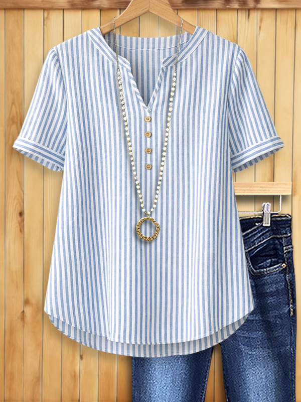 Bring effortless coastal charm to your everyday style with the Coastal Breeze Stripe Henley Top. Featuring soft blue-and-white stripes, a relaxed silhouette, and a flattering henley neckline with wooden buttons, this blouse blends comfort with classic style. Lightweight and breathable, it pairs beautifully with jeans or shorts for a casual day out, weekend brunch, or beachside stroll.