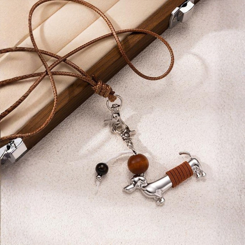 Bring a touch of playful personality to your outfit with the Dachshund Charm Leather Necklace. Featuring a sleek metal dachshund accented with warm wooden beads and a rustic leather cord, this accessory adds whimsy without overpowering your look. Lightweight and versatile, it pairs effortlessly with casual tops, tunics, or sweaters for an adorable finishing touch.