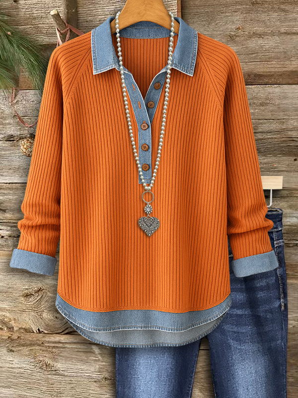 This ribbed Henley top blends cozy texture with a fun, denim-trimmed twist. The warm pumpkin shade brings instant energy to your outfit, while the buttoned neckline adds casual charm. Throw it on with jeans for a relaxed weekend look or layer it under a jacket when the weather turns cooler.