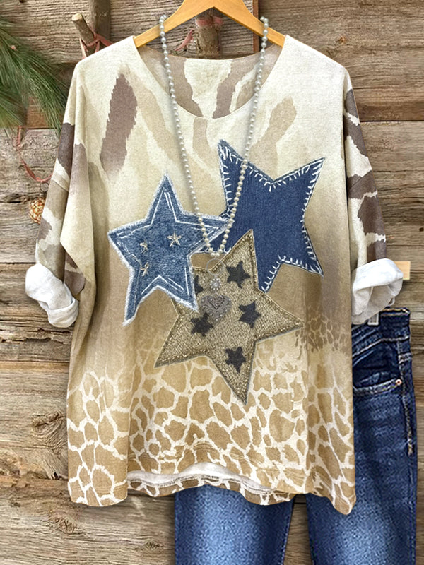 Bring a touch of laid-back charm to your everyday style with this Desert Star Patchwork Tee. The relaxed fit and soft crew-neck design create effortless comfort, while the denim star appliqués add a playful, Americana twist. Rolled long sleeves give it a casually chic finish—perfect for pairing with jeans for a cozy, free-spirited look.