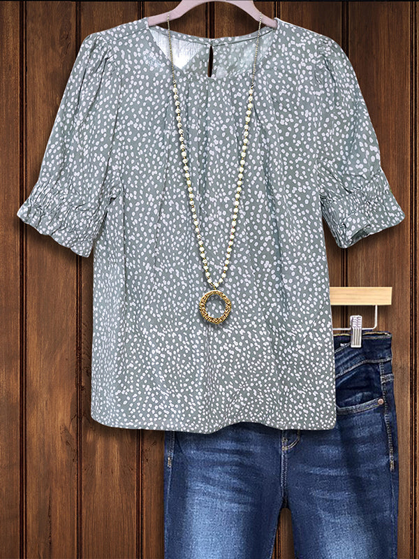 Embrace playful sophistication with our Dotted Print Ruffle Casual Blouse. Featuring a charming dot pattern and delicate ruffle accents, this blouse exudes feminine charm. Perfect for southern outings or casual gatherings, its lightweight fabric keeps you cool and stylish. Pair with jeans or a denim skirt for a timeless southern look that's effortlessly chic.