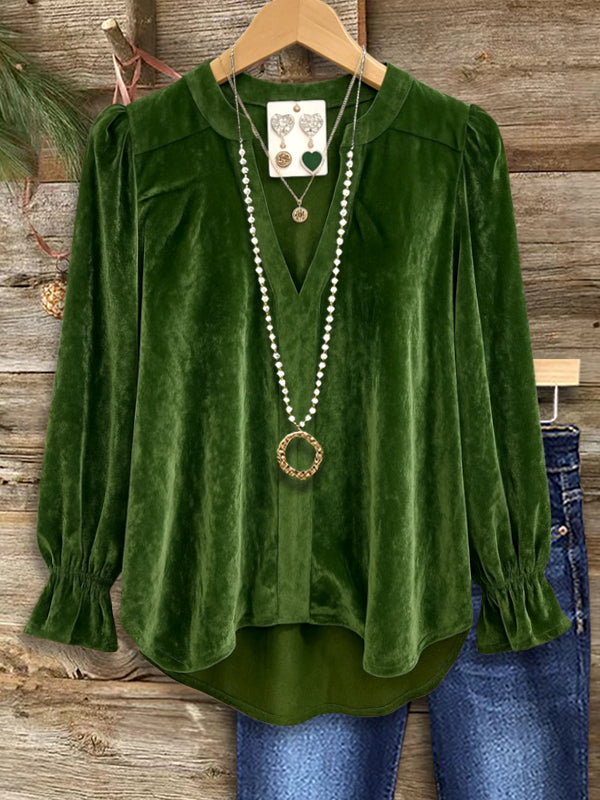 Elegance meets comfort in this Emerald Velvet V‑Neck Blouse. The velvety finish adds richness, while the V‑neckline and lightly puffed sleeves offer a graceful silhouette. The slightly longer hem pairs beautifully with denim or skirts for a luxurious seasonal look.