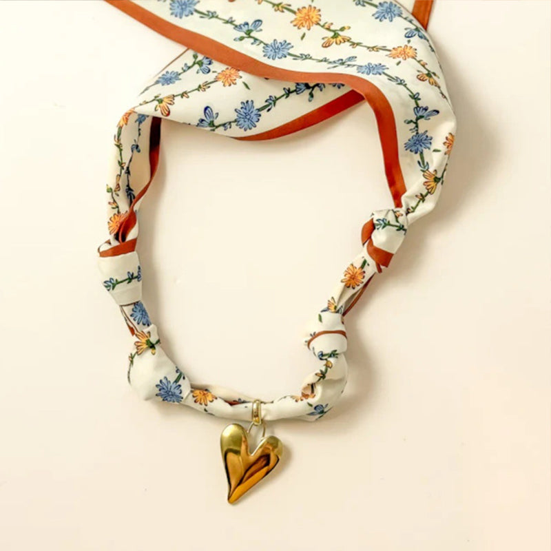 Romantic and chic, this silk scarf necklace features a delicate floral print with a gleaming golden heart pendant. Soft to the touch and effortlessly stylish, it’s perfect for adding a hint of romance to everyday looks. Pair it with a blouse or sweater for a charming, heartfelt accent.