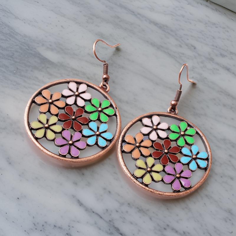 Floral design multicolor hoop-drop earrings add an eccentric flair to any look. Pair with any ensemble for an added splash of color.