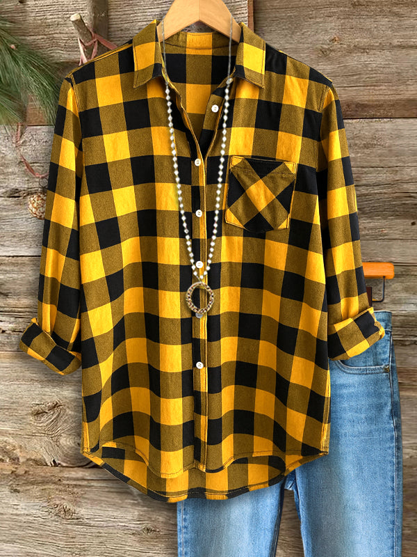 Add a pop of bold color to your casual wardrobe with this golden buffalo check shirt. The classic plaid pattern gets a fresh twist with warm, energetic tones. Comfortable, breathable, and designed for everyday wear, it works perfectly with jeans, boots, or layered under a jacket. A go-to piece for fall outings, backyard gatherings, and cozy weekends.