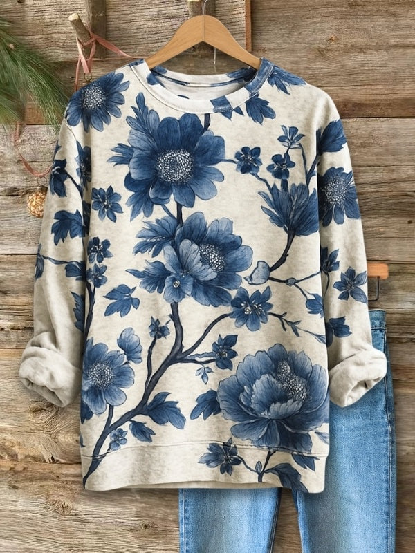 This soft sweatshirt stands out with its bold indigo floral artwork and cozy cotton-blend feel. Easy to wear, warm, and stylish, it’s the perfect throw-on piece for coffee runs, travel days, or comfy weekends at home.