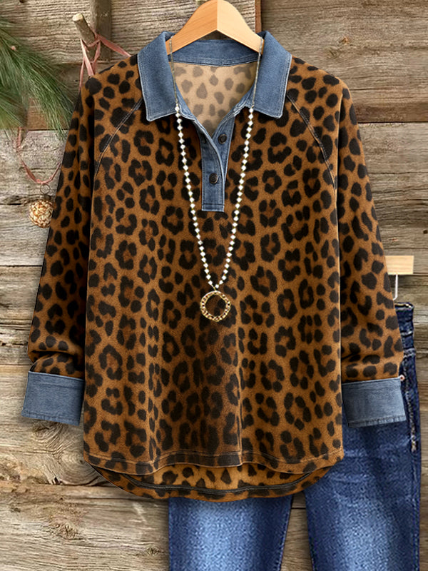 Bold, warm, and effortlessly cool—this leopard-print polo top brings a fun twist to casual outfitting. The contrast denim-style collar adds a modern touch, while the relaxed fit and long sleeves keep it comfortable. Perfect for weekend adventures, laid-back lunches, or days you want a little extra attitude. Pair with denim for a confident, standout look.