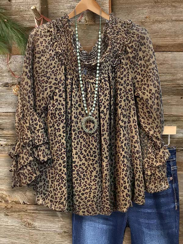 Turn heads with the bold and feminine Leopard Print Gathered Tiered Ruffle Sleeve Blouse. This eye-catching piece features a trendy leopard print, complemented by tiered ruffle sleeves that add a flirty, layered dimension. The gathered design flatters the figure, while the playful ruffles provide movement and texture. Perfect for both casual outings and evening events, this blouse pairs beautifully with skinny jeans or a skirt for a look that exudes Southern charm with a wild twist.