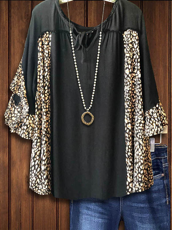 Elevate your look with our Leopard Print Patchwork Ruffled Lace-Up Blouse. A feminine and chic choice for any occasion.