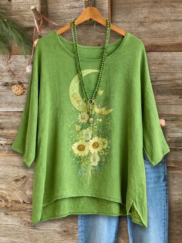 This airy linen-blend top features a dreamy moon-and-flowers print that feels both boho and calming. With a relaxed drape and soft touch, it pairs beautifully with jeans or wide-leg pants for an effortlessly artsy, nature-inspired look.