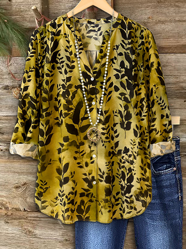 Inspired by nature, the Olive Breeze Botanical Blouse features soft leaf silhouettes over a warm olive background. The relaxed V-neck and airy sleeves add effortless comfort, making it a perfect everyday piece.