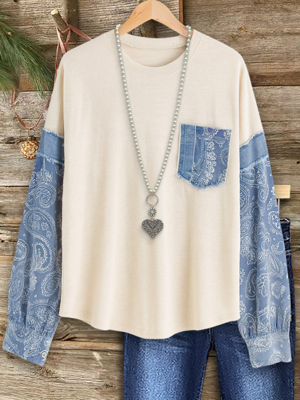 Casual with a touch of vintage charm, this Paisley Patchwork Casual Top features a soft crew neckline and beautifully patterned sleeves. The denim pocket and paisley details add artisan character, while the relaxed silhouette keeps it comfortable for all-day wear. Pair with jeans for a coordinated, effortlessly cool look.