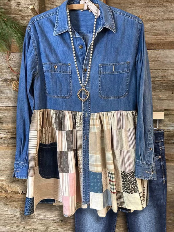 This denim prairie tunic blends rugged charm with soft, handcrafted patchwork for a truly unique look. The button-down top keeps things classic, while the flared patchwork hem adds a nostalgic, homespun touch. Comfortable, versatile, and full of personality, it’s perfect for those who love vintage-inspired style with a modern twist.