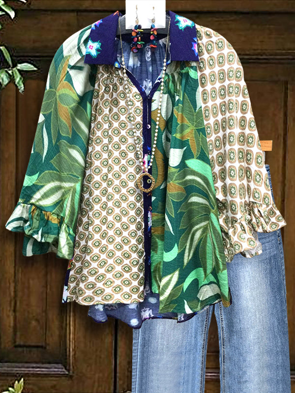 Patchwork blouse with feminine ruffle sleeves and button-up front, chic for casual or date wear.