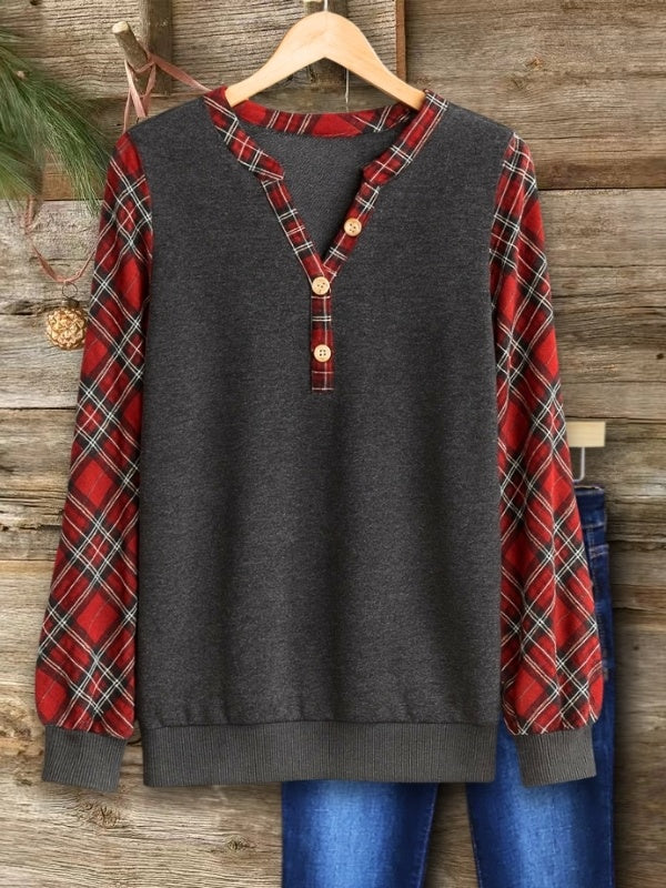 This cozy Henley top pairs soft knit fabric with festive plaid sleeves for a warm, seasonal look. The wooden buttons add a rustic touch, making it great for holiday photos, casual gatherings, or everyday cozy styling.