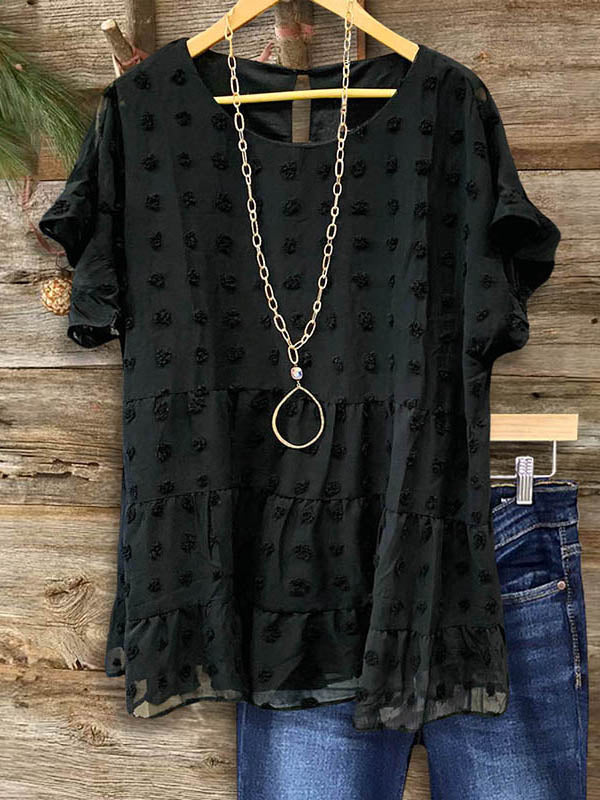 Add a playful twist to your wardrobe with our Polka Dot Jacquard Ruffle Sleeve Blouse. Crafted from luxurious jacquard fabric with chic polka dot detailing, this blouse offers a sophisticated yet whimsical look. The ruffle sleeves add a touch of charm, while the relaxed fit ensures comfort. Whether paired with tailored trousers for a polished ensemble or denim for a casual day out, this blouse is sure to make a statement with its timeless style.