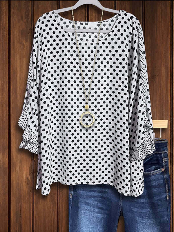 Embrace playful charm with the Polka Dot Print Patchwork Ruffle Blouse. This blouse features a delightful polka dot print and patchwork design that adds a touch of whimsy. The ruffled details enhance its feminine appeal, while the lightweight, breathable fabric ensures comfort on warm Southern days. The relaxed fit makes it perfect for casual outings or gatherings. Pair it with jeans for a laid-back look or a skirt for a more polished ensemble. Embrace the fun and stylish spirit of Southern fashion with this unique and versatile blouse.