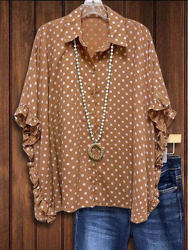 Add a touch of retro flair to your wardrobe with our Polka Dot Print Ruffle Batwing Sleeve Blouse, featuring playful polka dots and chic batwing sleeves. Perfect for brunches on sunny verandas or exploring historic landmarks, this blouse pairs effortlessly with tailored shorts and sandals. Embrace southern charm with a nod to vintage-inspired fashion, celebrating timeless style with a modern twist.