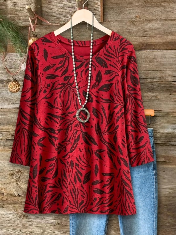 This red botanical top adds a bold pop of color with its flowy A-line fit. Lightweight, breathable, and flattering on all body types. Perfect for pairing with jeans or leggings for easy everyday style.