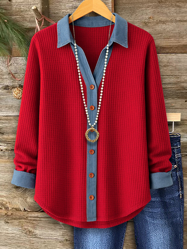 Add a touch of everyday charm with this Red & Denim Contrast Button Shirt. The soft waffle-knit texture pairs beautifully with the denim-trimmed V-neck and cuffs, creating a relaxed yet polished look. Roll-tab sleeves and a curved hem make it perfect for layering with jeans or leggings—your new go-to top for casual outings, weekend errands, and cozy days.