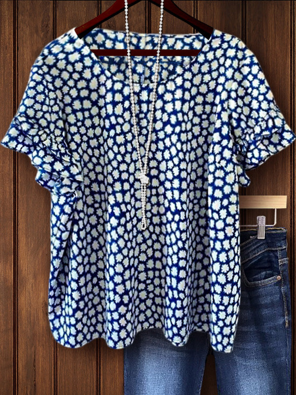 Embrace the beauty of spring and summer with this floral top featuring elegant ruffled sleeves. The combination of blue and white floral prints and flowing loose silhouette enhances the overall casual feel and durability. Perfect to pair with your favorite blue jeans.