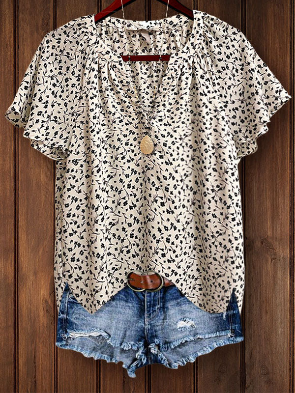 The floral print showcases an array of black flowers, adding natural beauty and femininity, and the notched V-neck and raglan silhouette's bell sleeves make the top visually appealing, perfect for adding a touch of style and comfort to your outfit. Pleating detail refers to a specific type of detailed stitching that adds texture and visual interest to a shirt.