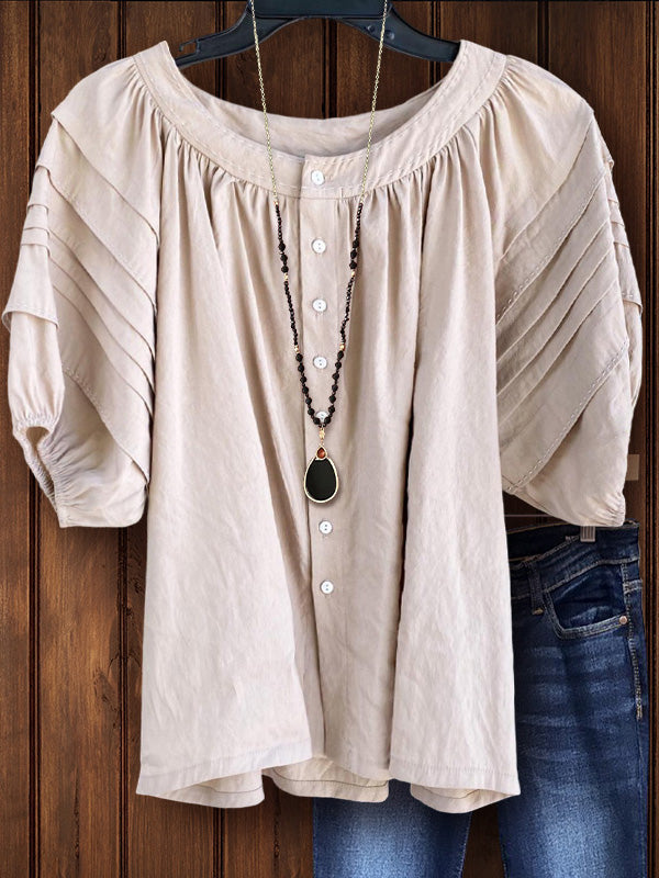 This apricot blouse adds a touch of gentle femininity to your outfit. The elegant loose silhouette and layered pleated sleeve design enhance the overall fashion sense. This top is made from breathable cotton-feel fabric to keep you comfortable all day long.