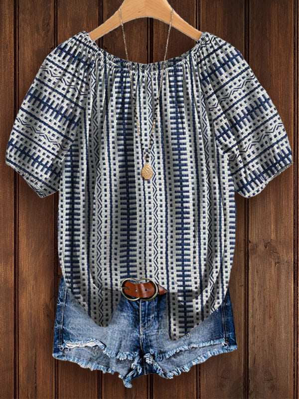 The top is a stylish and vibrant piece that combines traditional design elements with contemporary fashion. The scoop neckline creates a soft and curved line that enhances the neck and collarbone adding a touch of elegance. Inspired by traditional designs, the pattern showcases a variety of geometric shapes and motifs that reflect cultural heritage and artisanal craftsmanship.