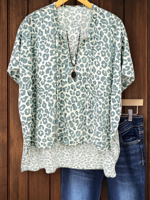 The top features a classic leopard print with distinctive green spots. This timeless pattern adds a touch of wild sophistication and makes a bold fashion statement. The V-neck design elongates the neckline and draws attention to the collarbone. The loose fit and hem design that is short in the front and long in the back create a charming effect.