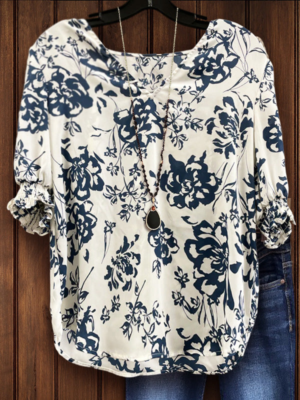 Wear our casual floral print V-neck top for comfort and versatility. The elegant navy blue floral print and charming V-neck design create a feminine and romantic atmosphere, while the pleated detail at the cuffs and flowing fabric enhance the overall sophistication and comfort.