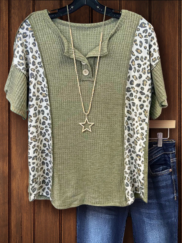 This waffle T-shirt features a stylish leopard print patchwork design, and buckle details on the versatile crew neck add a chic touch. The combination of green hues and soft, skin-friendly waffle fabric makes it perfect for sunny, warm days.