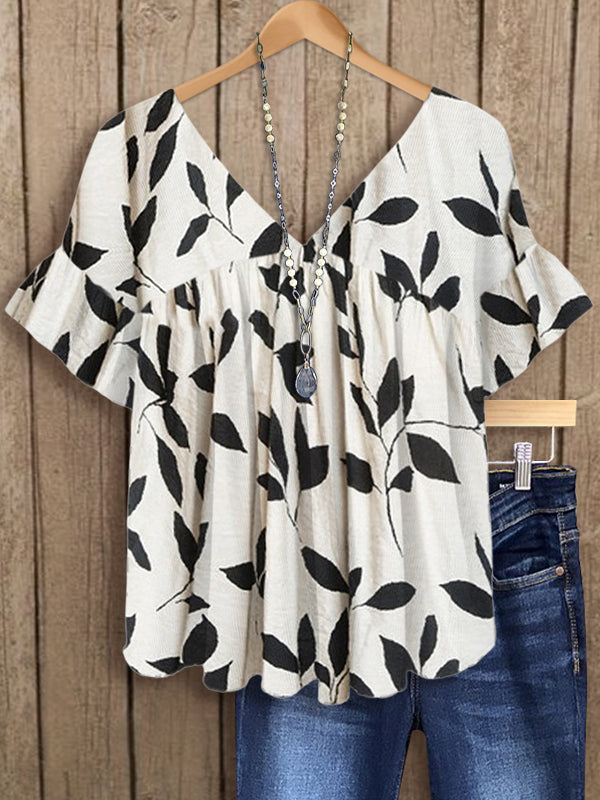 The Leaves Print Ruffle Sleeve Top is a chic and nature-inspired garment that embraces botanical beauty. Featuring a charming leaves print and delightful ruffle sleeves, this top effortlessly combines elegance and whimsy, making it a stylish choice for embracing the essence of the outdoors.