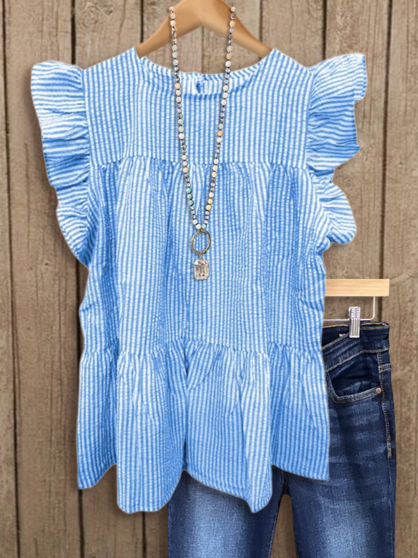 The Striped Layered Pleated Ruffle Top is a versatile and stylish garment that features multiple layers of ruffles and pleats, creating a unique textured look. The striped pattern adds a classic touch, while the flowy silhouette offers comfort and elegance.