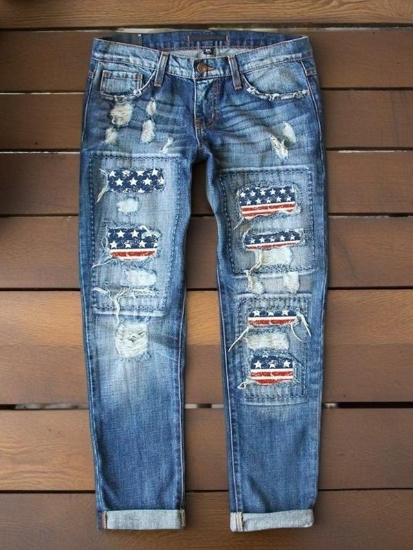 Make a patriotic statement with our Retro Flag Pattern Distressed Pencil Jeans. These jeans are a celebration of Americana with their distressed details and bold flag pattern. The pencil fit is flattering and modern, while the distressed elements add character and edge. Pair them with a simple white tee and red pumps for a look that's as classic as it is cool.