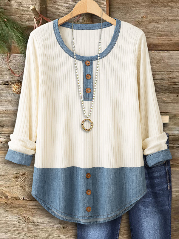 This ribbed patchwork Henley top blends cozy texture with a modern casual vibe. The contrast denim-style panels highlight the neckline and hem, giving the design a fresh, crafted look. Its soft rib-knit fabric offers all-day comfort, while the relaxed silhouette makes it perfect for layering or wearing on its own. Pair it with jeans for an effortlessly laid-back yet stylish outfit.