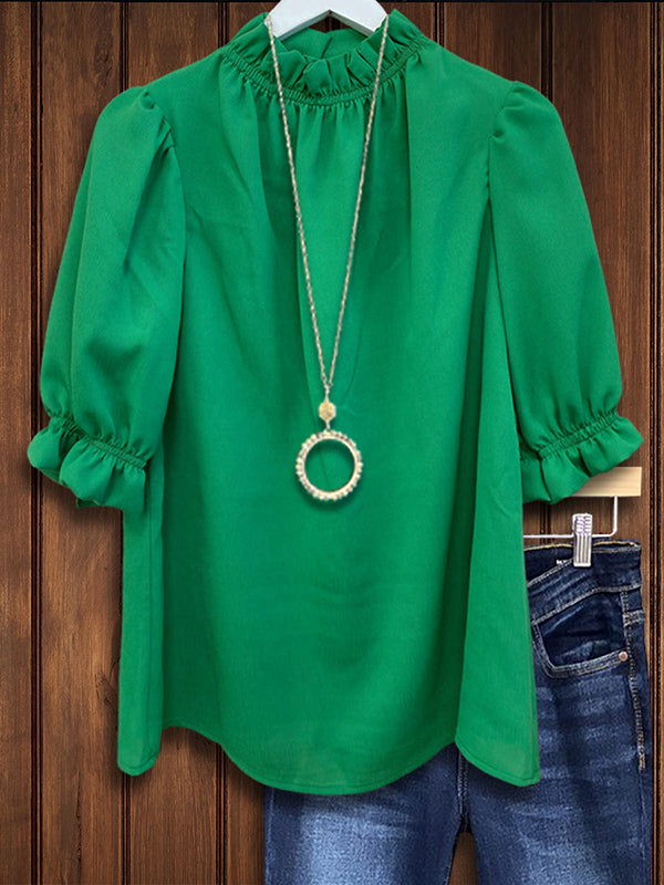 Elevate your Southern style with our Solid Color Loose Ruffle Sleeve Blouse. Effortless and chic, this blouse offers a perfect blend of comfort and sophistication, featuring loose-fitting elegance and playful ruffle sleeves.