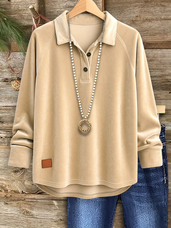 Simple, soft, and timeless—the Solid Color Velvet Casual Blouse is your go-to for everyday comfort. With a buttoned collar and relaxed fit, it pairs easily with denim or joggers. The neutral tone brings effortless sophistication to any outfit.