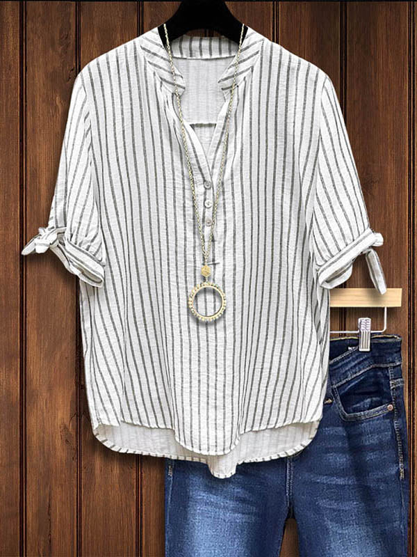 Add a touch of Southern sophistication to your wardrobe with the Split Collar Striped Knotted Blouse. This blouse features a classic striped pattern and a chic split collar, offering a modern twist on a timeless design. The knotted front detail adds a playful and trendy element, perfect for both casual and semi-formal occasions. Made from lightweight, breathable fabric, it ensures comfort throughout the day. Pair it with jeans or tailored pants for a polished ensemble. Embrace the blend of classic stripes and contemporary style with this versatile blouse, ideal for any Southern fashionista.