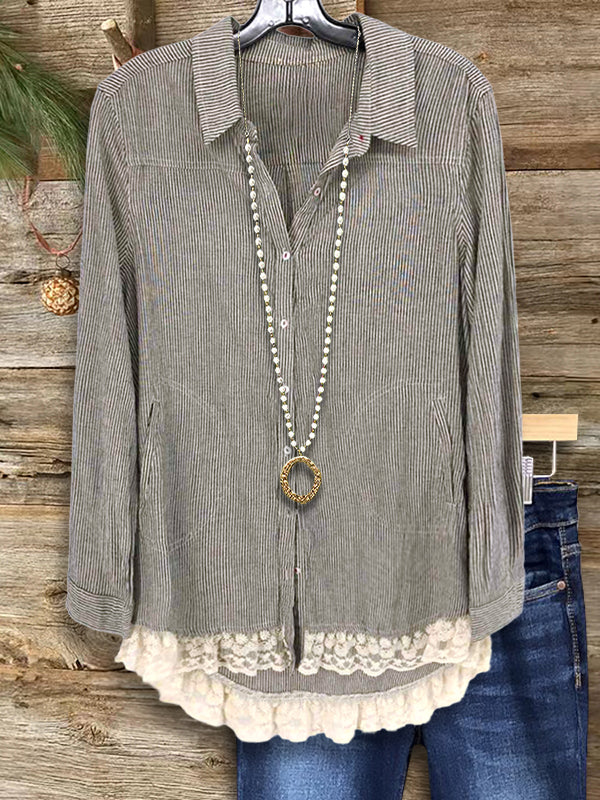 Feminine meets classic with the Striped Buttoned Lace Hem Blouse. Featuring subtle stripes, charming buttons, and a lace-trimmed hem, this piece adds elegance to your casual wardrobe. Pair it with tailored pants for a polished look.