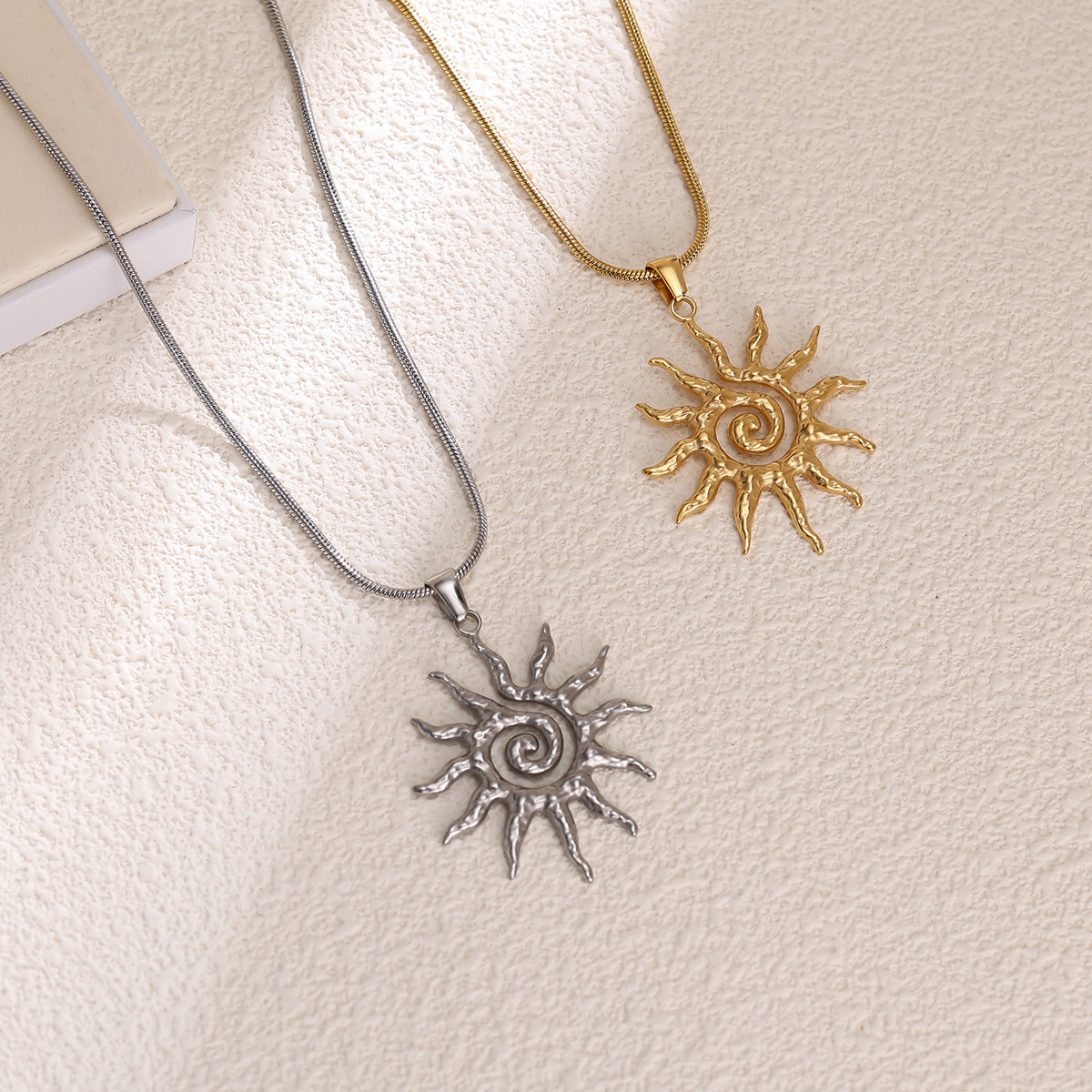 This artisan-inspired sunburst pendant brings warmth and personality to any outfit. Available in gold or silver tones, it features a textured handcrafted look that shines beautifully in the light. Wear it alone as a statement piece or layer it with delicate chains for a stylish, boho-inspired finish.