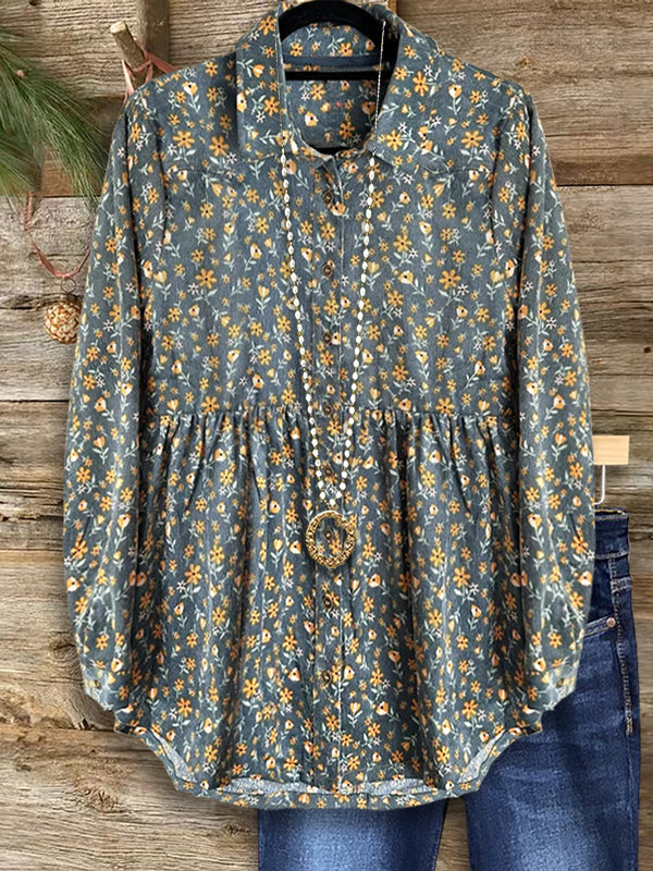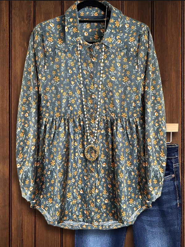 Step back in time with this vintage-inspired floral corduroy blouse. Soft corduroy fabric adds texture and warmth, while the delicate floral print gives it a charming, retro appeal. Ideal for cooler days, this blouse can be easily paired with denim or skirts for a cozy yet fashionable look.