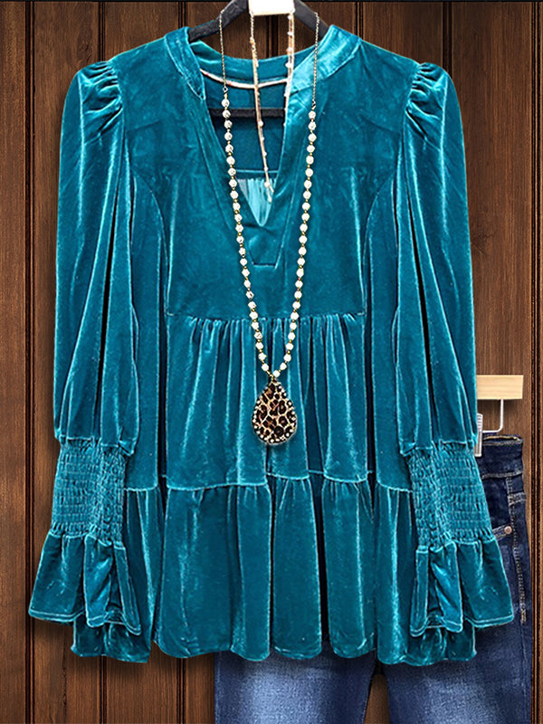 Luxe and romantic, the Vintage Velvet Layered Ruffle Blouse offers a sophisticated twist on classic velvet. With layered ruffles adding volume and charm, this blouse is perfect for holiday gatherings or evening outings. Style it with dark denim or tailored pants for a polished finish.