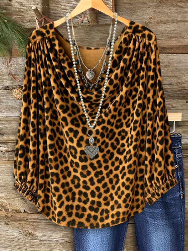 Turn heads with this Wild Leopard Draped Blouse, designed with a soft cowl neckline for effortless elegance. The relaxed fit and elastic cuffs create a flattering silhouette, while the bold animal print adds confidence. Pair it with denim or dressy bottoms for a chic look suitable from daytime to evening.